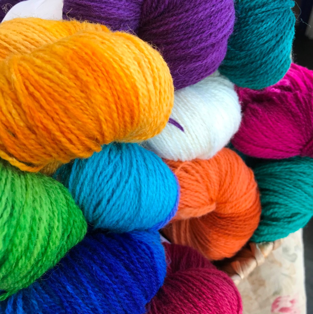 We are fortunate to have a small amount of Ellie’s hand dyed, homegrown Pastorale yarn in 4ply and DK